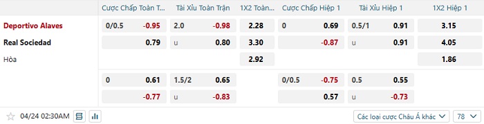 Tip kèo bóng đá trận Alaves vs Real Sociedad  02h30 ngày 24/04/2025 VĐQG Tây Ban Nha