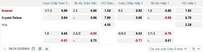 Tip kèo Châu Á hiệp 1 Arsenal vs Crystal Palace