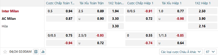 Tip kèo Châu Á full trận Inter Milan vs AC Milan