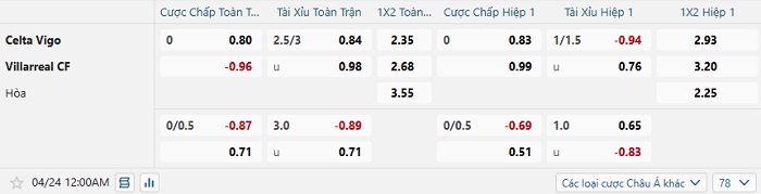 Tip kèo Châu Á full trận Celta Vigo vs Villarreal