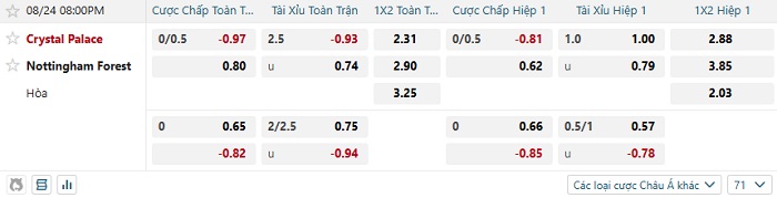 Tip kèo Châu Á full trận Crystal Palace vs Nottingham Forest