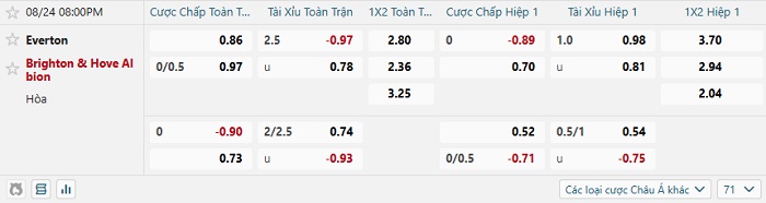 Tip kèo Châu Á full trận Everton vs Brighton