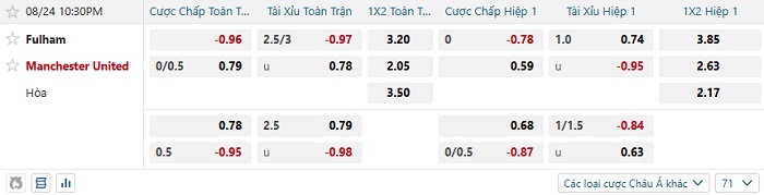 Tip kèo Châu Á hiệp 1 Fulham vs Man United