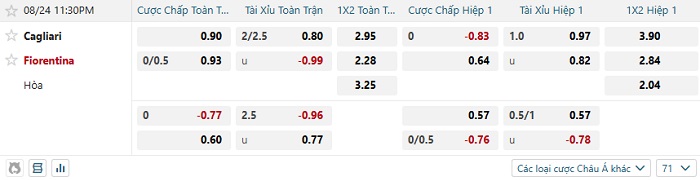 Tip kèo Châu Á hiệp 1 Cagliari vs Fiorentina