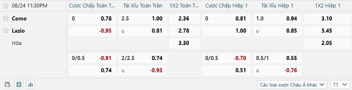 Tip kèo Châu Á full trận Como vs Lazio