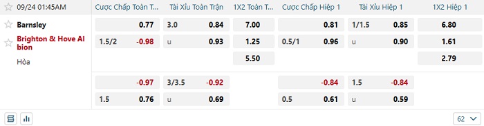 Tip kèo Châu Á full trận Barnsley vs Brighton
