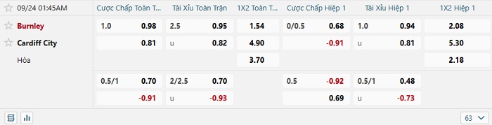 Tip kèo Châu Á hiệp 1 Burnley vs Cardiff