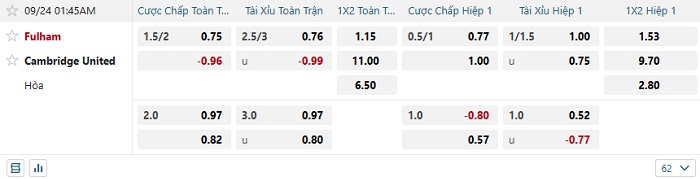 Tip kèo Châu Á full trận Fulham vs Cambridge