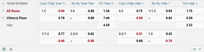 Tip kèo Châu Á hiệp 1 Roma vs Plzen