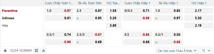 Tip kèo Châu Á hiệp 1 Fiorentina vs Udinese
