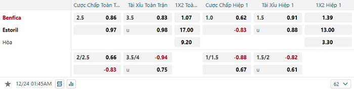 Tip kèo Châu Á hiệp 1 Benfica vs Estoril