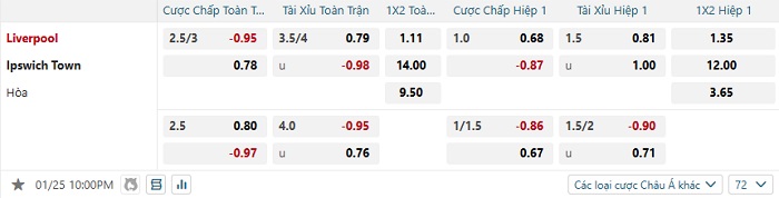 Tip kèo Châu Á hiệp 1 Liverpool vs Ipswich