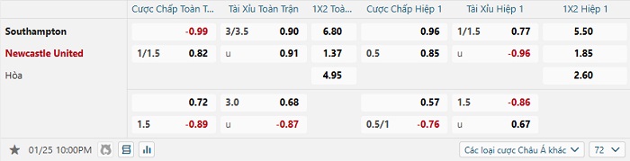 Tip kèo Châu Á full trận Southampton vs Newcastle