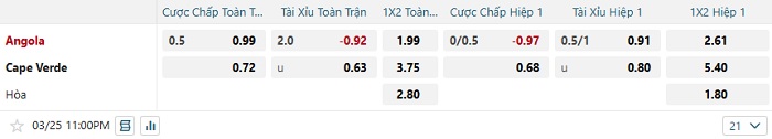 Tip kèo Châu Á hiệp 1 Angola vs Cape Verde