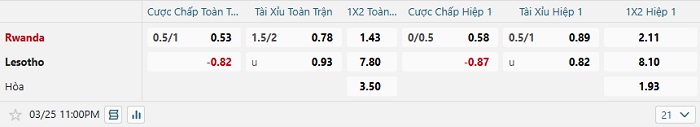 Tip kèo Châu Á hiệp 1 Rwanda vs Lesotho