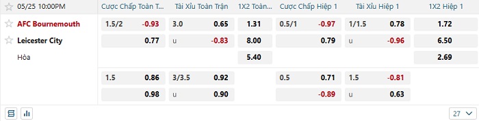 Tip kèo Châu Á hiệp 1 Bournemouth vs Leicester