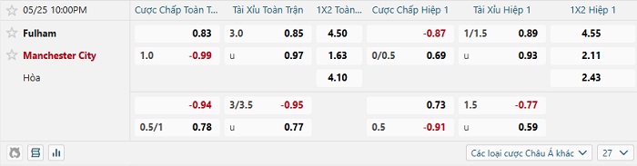 Tip kèo Châu Á hiệp 1 Fulham vs Man City
