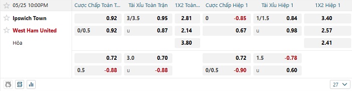 Tip kèo Châu Á hiệp 1 Ipswich vs West Ham