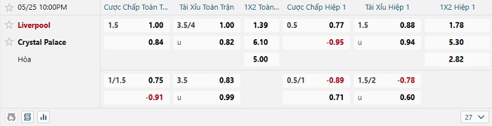 Tip kèo Châu Á full trận Liverpool vs Crystal Palace
