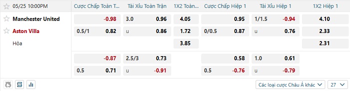 Tip kèo Châu Á hiệp 1 Man United vs Aston Villa