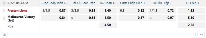 - Dự đoán tỷ số hiệp 1: Preston Lions 1 – 0 Melbourne Victory Youth