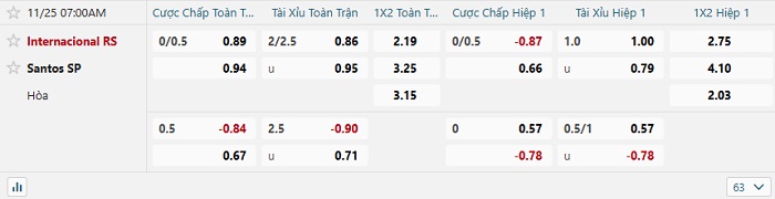 Tip kèo Châu Á hiệp 1 Internacional vs Santos