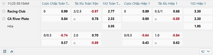 Tip kèo Châu Á hiệp 1 Racing Club vs River Plate
