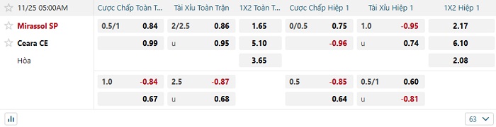 Tip kèo Châu Á hiệp 1 Mirassol vs Ceara