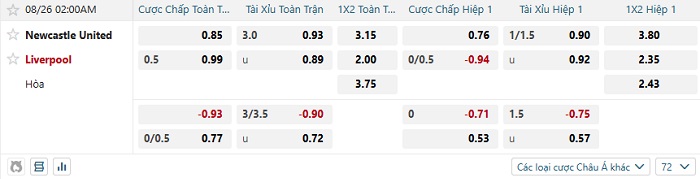 Tip kèo Châu Á hiệp 1 Newcastle vs Liverpool