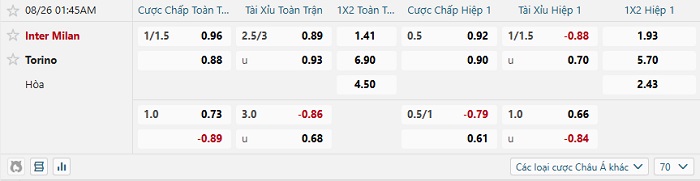 Tip kèo Châu Á hiệp 1 Inter Milan vs Torino