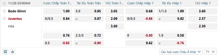 Tip kèo Châu Á hiệp 1 Bodo vs Juventus