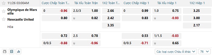 Tip kèo Châu Á full trận Marseille vs Newcastle