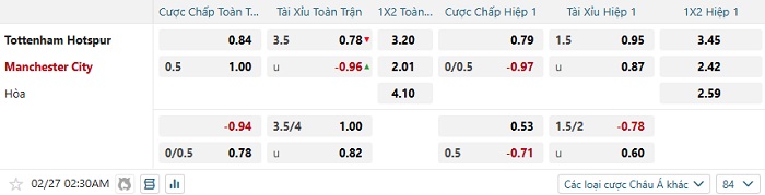 Tip kèo Châu Á full trận Tottenham vs Man City
