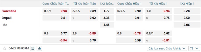 Tip kèo Châu Á hiệp 1 Fiorentina vs Empoli