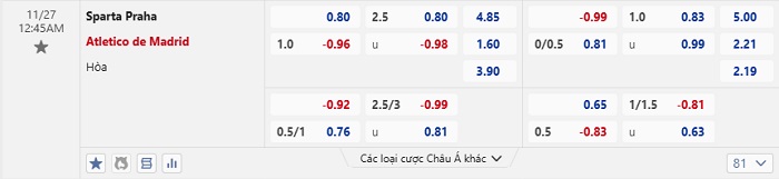 Tip kèo Châu Á hiệp 1 Sparta Praha vs Atletico Madrid