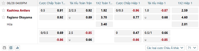 Tip kèo Châu Á hiệp 1 Kashima Antlers vs Fagiano Okayama