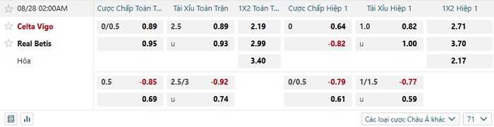 Tip kèo Châu Á hiệp 1 Celta Vigo vs Real Betis