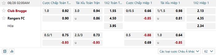 Tip kèo Châu Á full trận Club Brugge vs Rangers