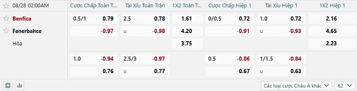 Tip kèo Châu Á full trận Benfica vs Fenerbahce