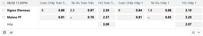 Tip kèo Châu Á full trận Sigma Olomouc vs Malmo