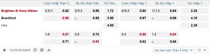 Tip kèo Châu Á hiệp 1 Brighton vs Brentford