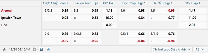 Tip kèo Châu Á full trận Arsenal vs Ipswich