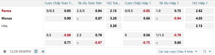 Tip kèo Châu Á hiệp 1 Parma vs Monza