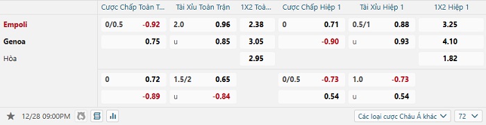 Tip kèo Châu Á full trận Empoli vs Genoa