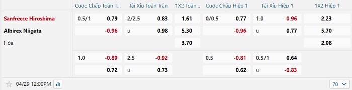Tip kèo Châu Á hiệp 1 Hiroshima Sanfrecce vs Albirex Niigata