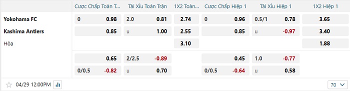 Tip kèo Châu Á hiệp 1 Yokohama FC vs Kashima Antlers