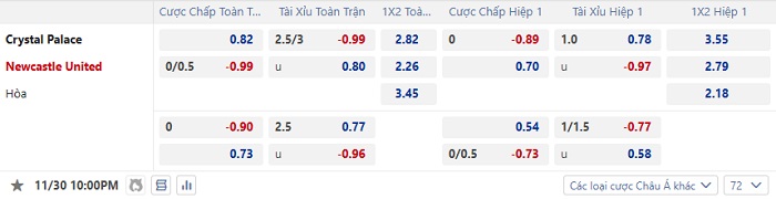 Tip kèo Châu Á full trận Crystal Palace vs Newcastle