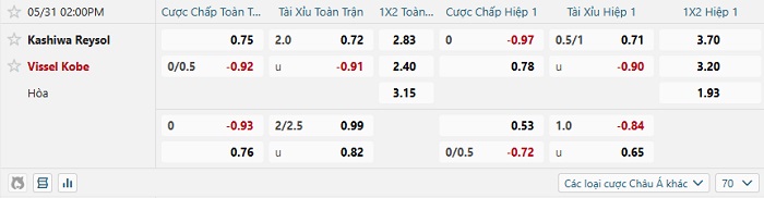 Tip kèo Châu Á hiệp 1 Kashiwa Reysol vs Vissel Kobe