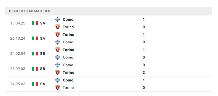 - Kèo tỷ số H2 Torino vs Como: 0-0