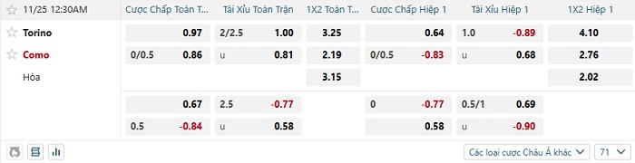 - Kèo tỷ số H1 Torino vs Como: 0-0